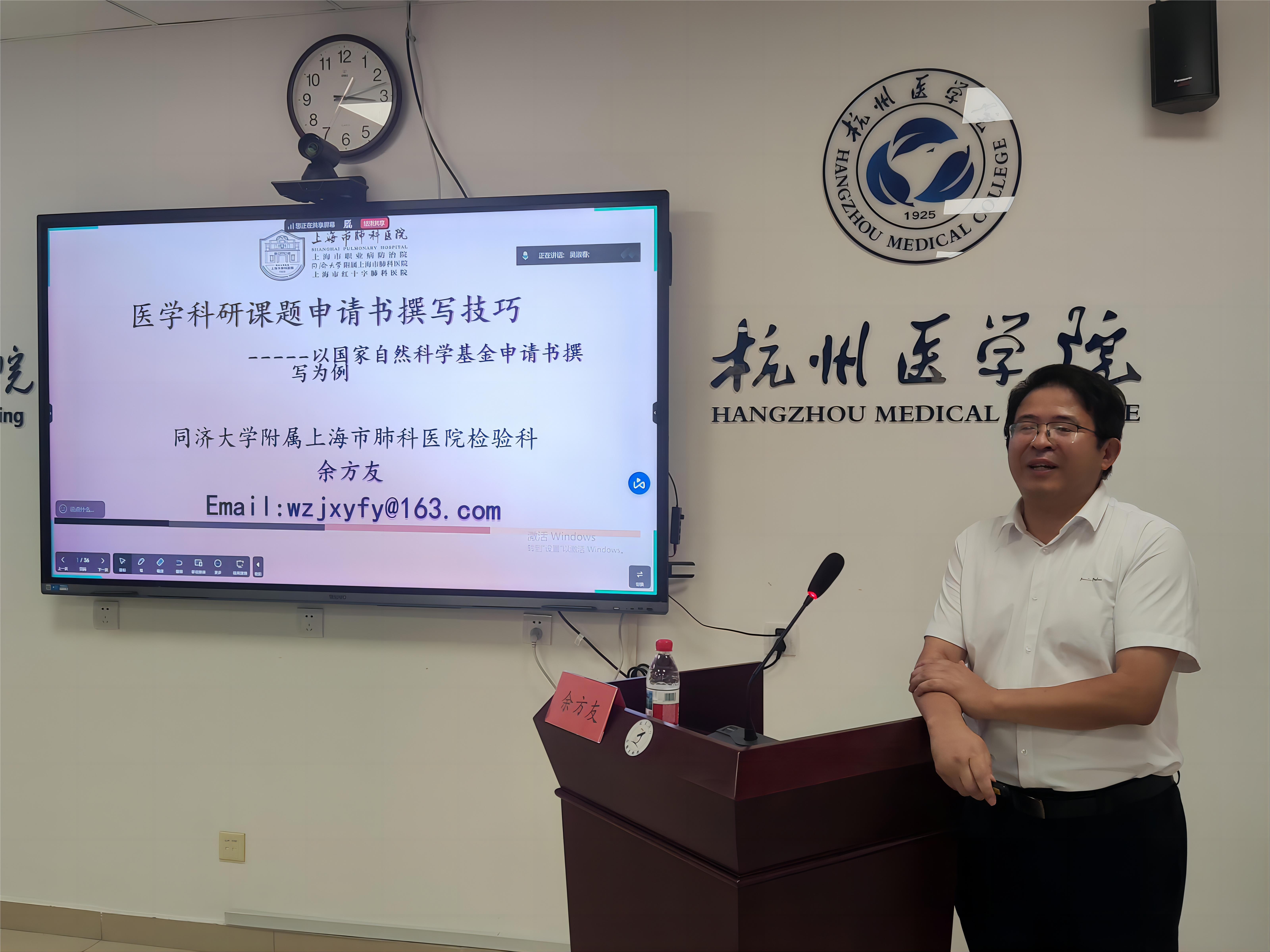 10月14日下午,检验医学院、生物工程学院“验真求实”大讲堂第52讲暨2026年国自然基金申报启动会在临安校区11号楼404会议室顺利召开。本次讲堂邀请到上海市肺科医院余方友教授,带来《医学科研课题申请书撰写技巧》的精彩讲座。学院领导、科研人员和部分研究生参与了此次活动,同时,杭医检验联盟单位部分科研人员通过线上腾讯会议聆听讲座。活动由金大智副院长主持。
