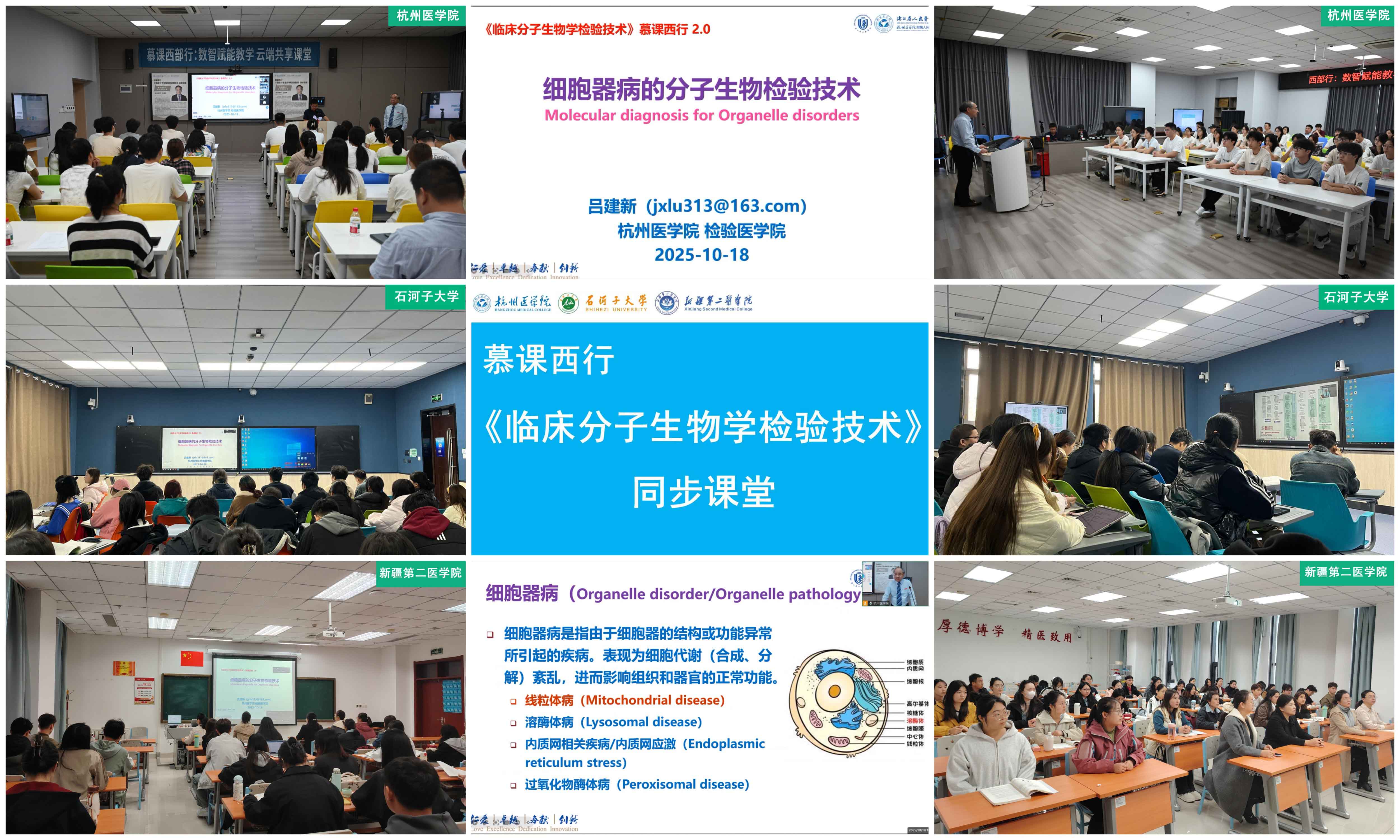 为积极响应 “慕课西部行 2.0” 行动部署,深入推进优质医学教育资源跨区域共享,探索协同育人新路径,10月18日上午,杭州医学院检验医学院、生物工程学院牵头联合石河子大学医学院检验系、新疆第二医学院临床医学院实验诊断教研室,成功举办《临床分子生物学检验技术》“三校同步课堂”教学活动。三校百余名师生通过云端相聚,围绕“细胞器(线粒体)疾病的分子检验诊断” 专题展开深度教学实践,打造了一场跨越地域的高质量医学教学范例。