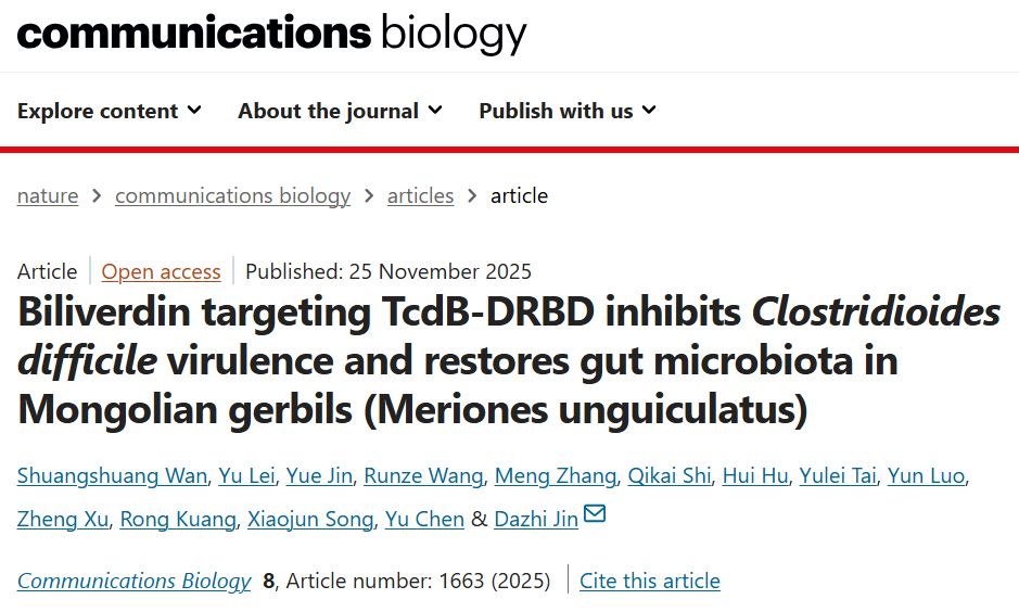 艰难梭菌感染(CDI)因其高复发率与抗生素耐药性成为全球公共卫生危机,现有治疗方案面临破坏肠道微生态平衡的困境。2025年11月,杭州医学院金大智/万双双团队在Nature旗下双一区TOP期刊《Communications Biology》发表突破性研究,首次揭示天然小分子胆绿素(BV)通过精准靶向毒素TcdB受体结合域(DRBD),实现非抗生素途径的抗CDI治疗,为临床提供全新干预策略。