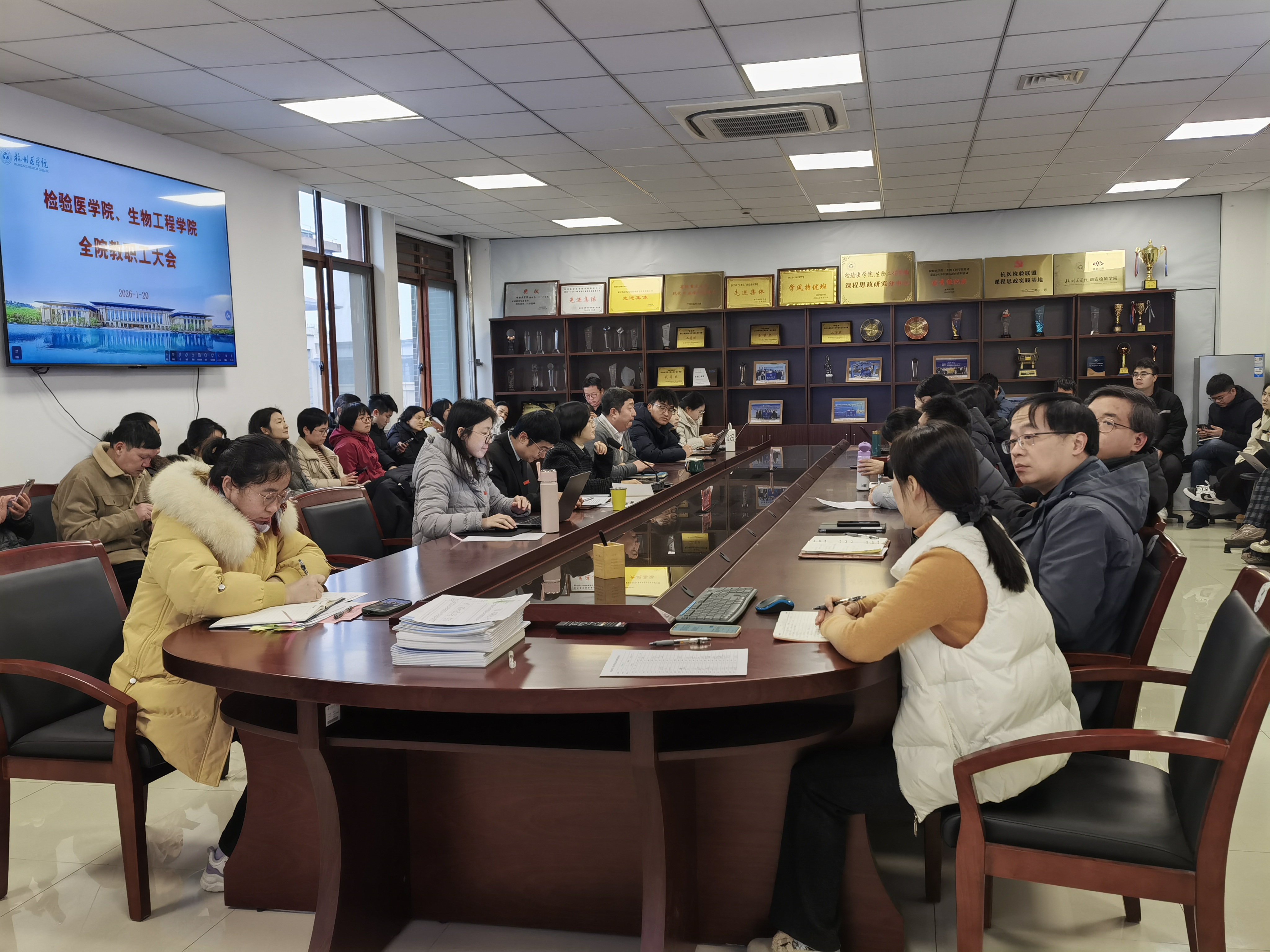 2026年1月20日上午,检验医学院、生物工程学院在临安校区11-404会议室隆重召开2025年度工作总结大会。学院全体教职工齐聚一堂,共同回顾过去一年的奋斗征程,系统梳理工作成效,凝聚发展共识,擘画2026年发展蓝图。会议由学院执行院长杨珺主持。