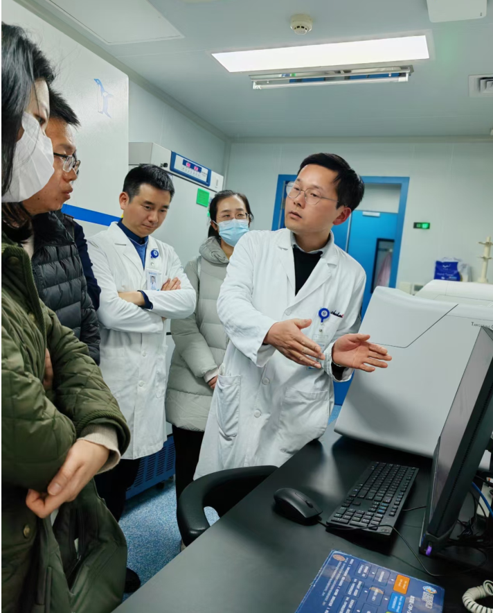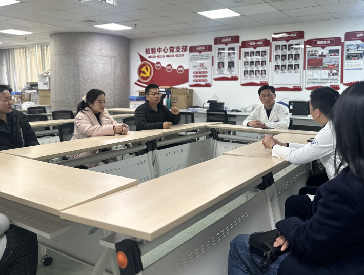 在何方主任团队的热情接待下,教研室教师首先走进检验中心分子室开展参观学习。检验中心分子室配备层流系统的标准化BSL-2实验室,全自动核酸提取仪、实时荧光PCR仪、杂交仪等国内外一线先进设备有序运行,涵盖病原微生物检测、分子遗传检测、药物基因组筛查等多项临床核心检测项目。何方主任结合实际工作场景,详细讲解了分子诊断技术的临床应用流程、质量控制标准及最新技术进展;杨正权老师重点分享了基于核酸质谱技术在基因组SNP检测中的实操经验,让在场教师对分子检验前沿技术的实际临床应用有了更直观、深刻的认知,有效加强了理论教学与临床实操之间的衔接。