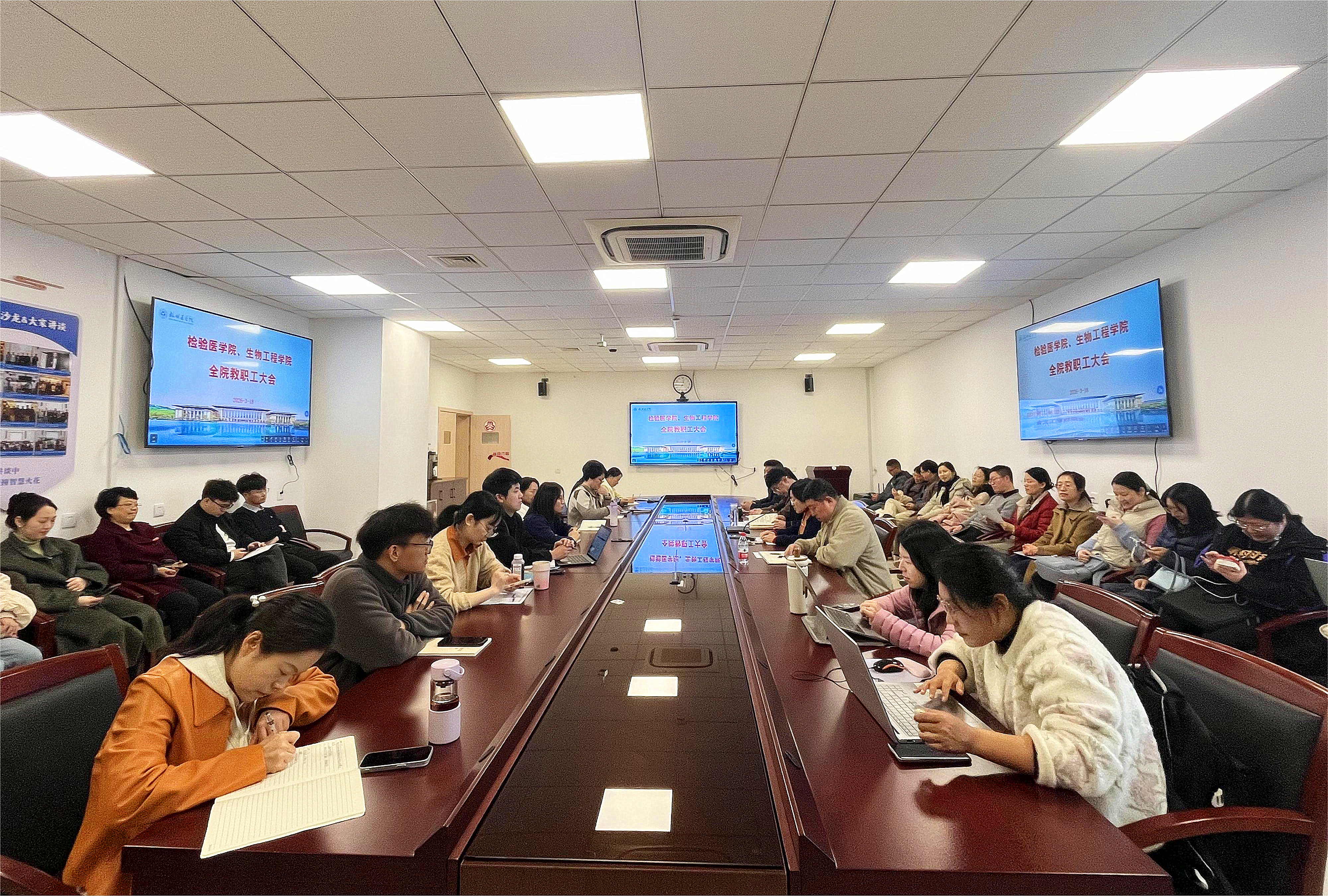 2026年3月18日下午,检验医学院、生物工程学院在临安校区11-404会议室召开教职工大会,传达学习学校近期重要会议精神,全面部署新学期党建、科研、教学、学生管理等各项重点工作。全院教职工参加了此次会议,会议由学院执行院长杨珺主持。
