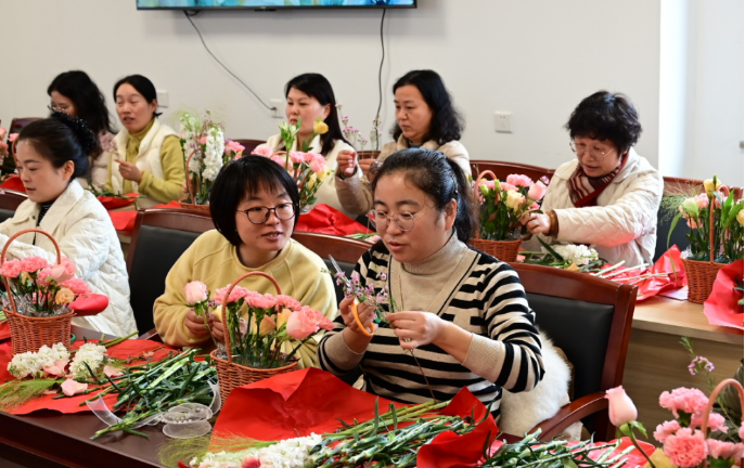 活动现场欢声笑语不断,气氛热烈而温馨。女教职工和学生们暂时放下繁忙的工作和学习,沉浸在花的世界里,感受着花香带来的宁静与愉悦。大家互相交流插花心得,分享创作灵感,欣赏彼此的作品,脸上都洋溢着幸福的笑容。一件件错落有致、生机盎然的插花作品,不仅展现了大家对美的理解和追求,更寄托了大家对美好生活的向往和祝福。