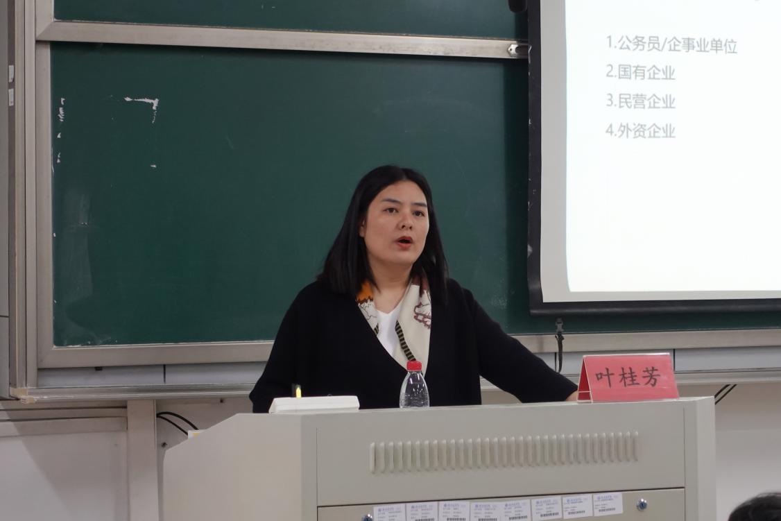 活动伊始,叶桂芳女士结合自身多年人力资源管理经验,系统介绍了卫生检验与检疫行业的发展趋势、用人单位对人才的核心能力要求以及当前就业市场的实际需求。她指出,检测行业并非只有实验室岗位,不同岗位对应不同特质,外向善沟通者适合销售与商务,细心严谨者适配科研与实验岗,鼓励同学们打破“专业对口即单一岗位”的思维局限,多维度拓展就业选择。