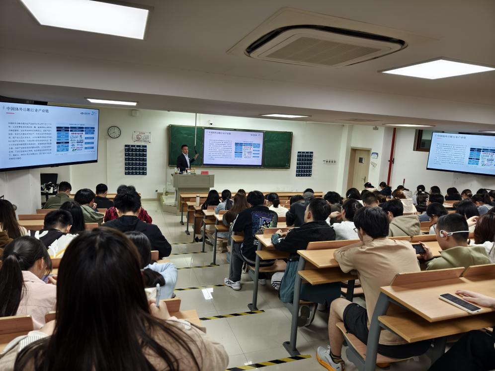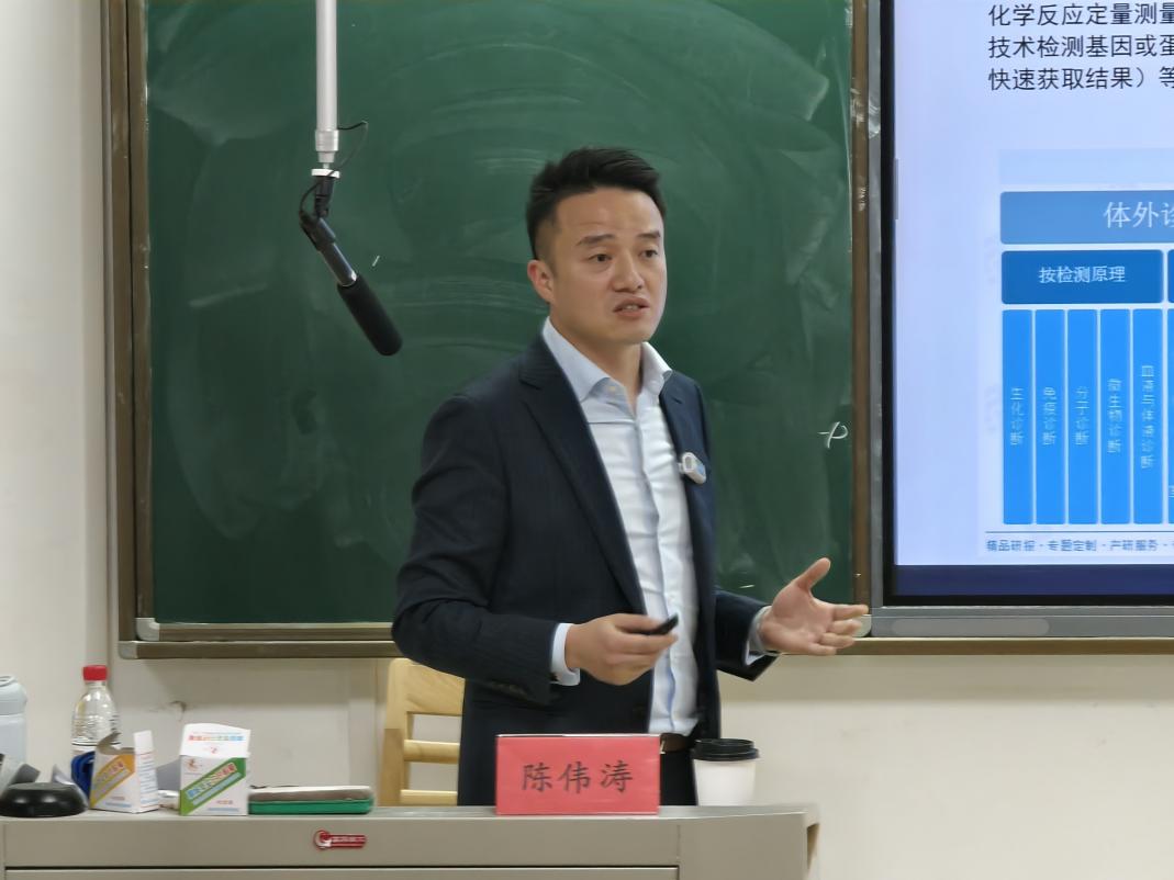 陈伟涛先生是业内资深专家,作为杭州市D类人才、杭州市体外诊断促进中心副会长,他兼具深厚的学术背景与丰富的产业经验。讲座中,他首先剖析了当前体外诊断行业在精准医疗和智能化趋势下的广阔前景,指出技术创新正不断催生新的岗位需求,为医学检验技术人才带来了多元化的发展机遇。他鼓励同学们不仅要夯实专业基础,更要积极拥抱交叉学科知识,提升综合竞争力。