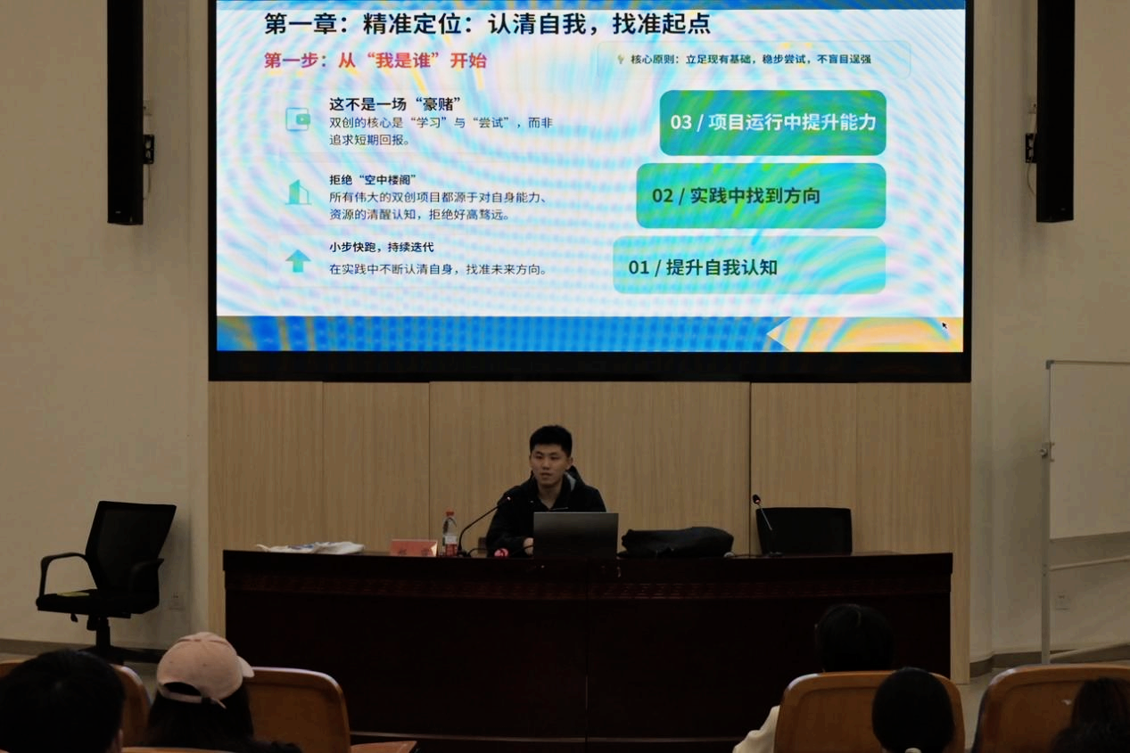 他强调,双创实践的第一步是精准自我定位。鼓励同学们在科研探索、社会实践、文艺创作等多元领域主动尝试,充分发掘自身优势,结合个人兴趣与现有资源理性选择发展方向。在实践过程中,必须始终坚守“学业第一”的原则,划定学业红线,通过科学的时间规划与任务管理,实现专业学习与双创实践的良性平衡。